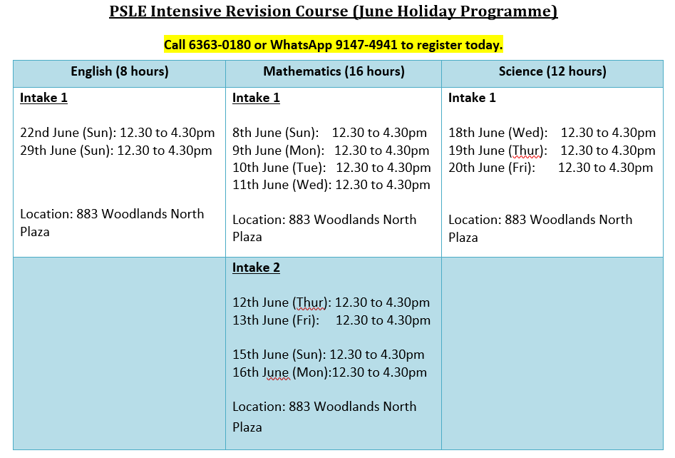 Due to feedback and requests from parents, we will be conducting our highly successful award-winning PSLE Revision Course during the holidays to better prepare our P6 students for the upcoming PSLE exams. Here is an overview of our PSLE June Revision Course: